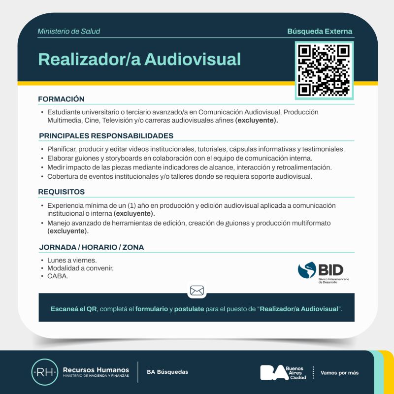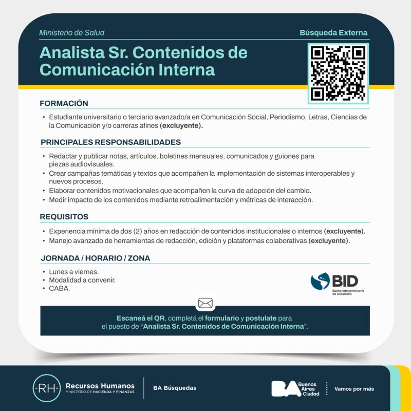 ornada: lunes a viernes👩💻 Modalidad: a convenir🌎 Zona: CABA 👉 Si cumplís con los requisitos y querés postularte, scaneá el QR y completá el formulario o ingresá al link https://lnkd.in/dje2jfEW.