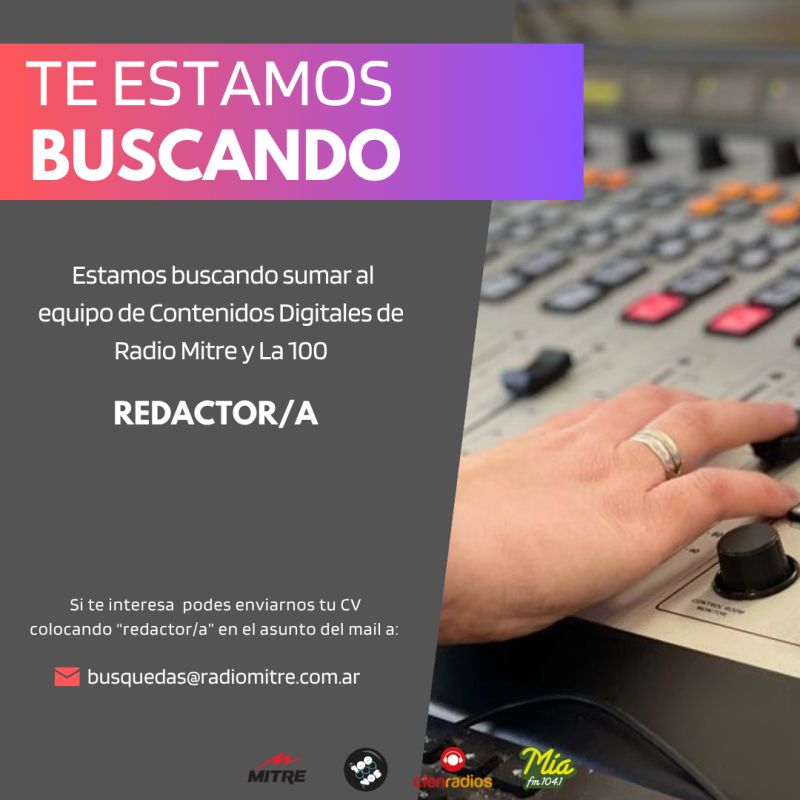 En Radio Mitre y La 100 estamos buscando REDACTORES/AS para sumarse al equipo de Contenidos Digitales! Esperamos tu postulación!