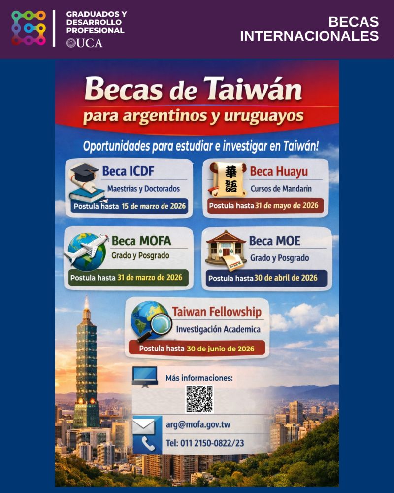Desde el Departamento de Graduados y Desarrollo Profesional compartimos esta oportunidad internacional. La Representación de Taiwán en la República Argentina ofrece distintas becas destinadas a estudiantes, graduados, docentes e investigadores interesados en realizar estudios, investigación o aprendizaje de mandarín en Taiwán. 📌 Se brindarán charlas informativas online: 📅 Miércoles 18 de febrero⏰ 17 a 18 […]