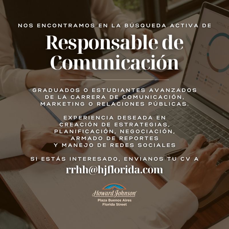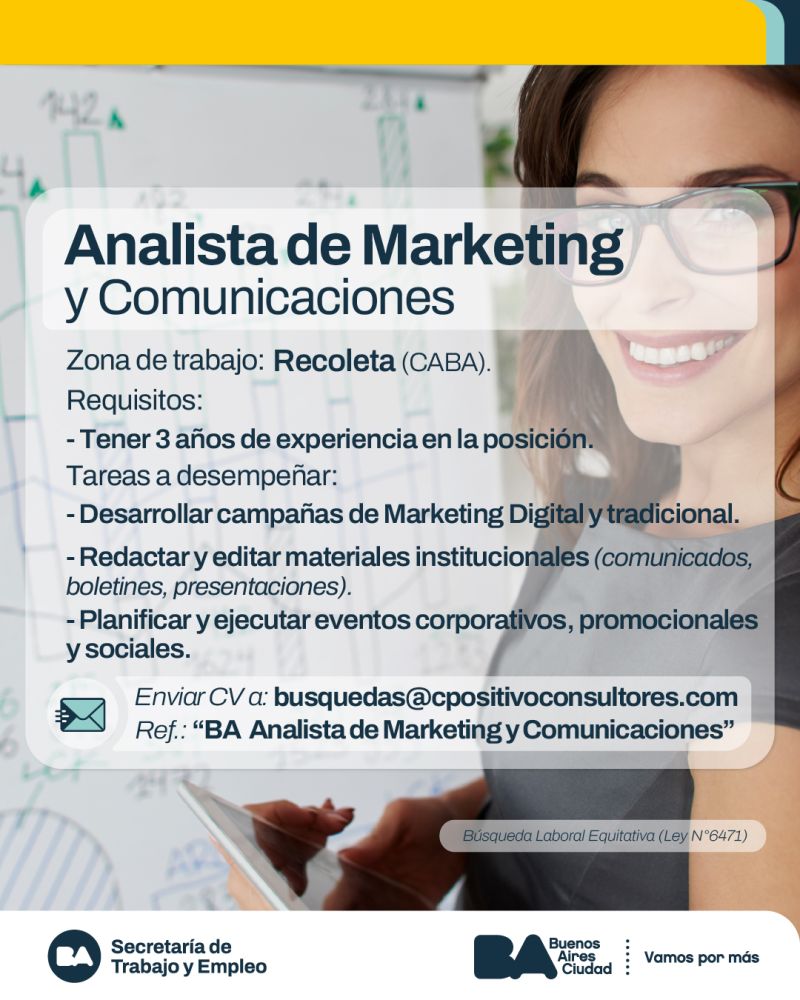 Zona de trabajo: Recoleta, CABA Requisitos: Tener tres años de experiencia en la posición Tareas a desempeñar: Desarrollar campañas de marketing digital y tradicional.Redactar y editar materiales institucionales (comunicados, boletines, presentaciones).Planificar y ejecutar eventos corporativos, promocionales y sociales. Correo electrónico donde enviar CV: busquedas@cpositivoconsultores.comReferencia a poner en el envío de CV: BA Analista de Marketing […]