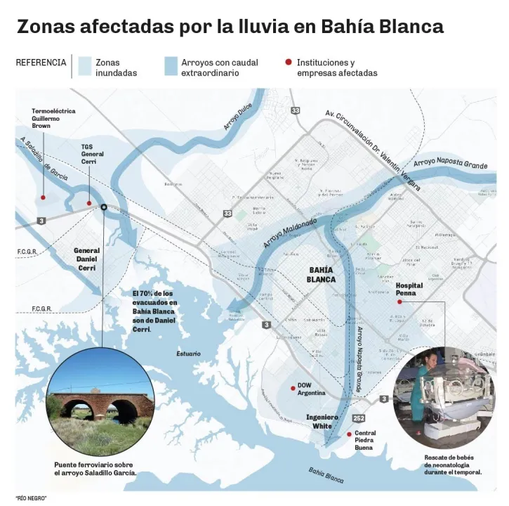 “Este evento extremo, el más intenso en la historia registrada de la ciudad, fue causado por un frente frío que llegó a la zona después de varios días de clima cálido y húmedo. Una semana antes, Bahía Blanca ya había recibido más de 80 mm de lluvia, lo que pudo haber contribuido a la saturación del suelo antes de la inundación”, señala el informe.