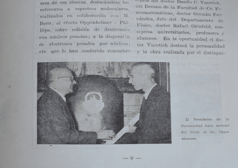 Según el Boletín Informativo Nº 8 de la Facultad de Ciencias Físicomatemáticas (septiembre-diciembre de 1961), así fue su llegada: “Concurrió a la Universidad Nacional de La Plata el sabio norteamericano Robert Oppenheimer, director desde 1947 del Instituto de Estudios Superiores de Princeton”, detalla el documento. De acuerdo a la publicación, “el doctor Vucetich destacó la personalidad y la obra realizada por el distinguido huésped, resaltando su extraordinaria labor en el campo de la física moderna, su posición humanista y su categoría de maestro, demostrada a través de largos años dedicados al servicio del progreso científico y social de la humanidad”.